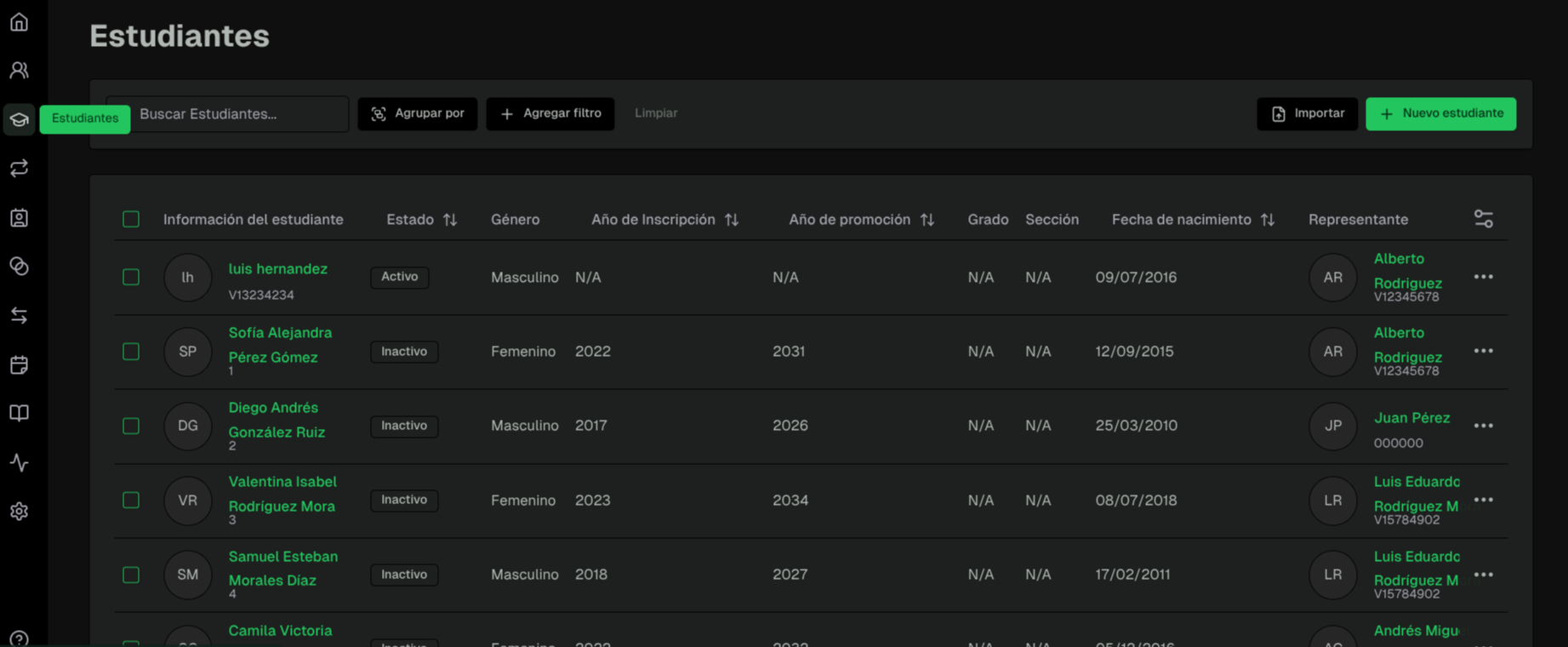 - Estudiantes sin representante asignado