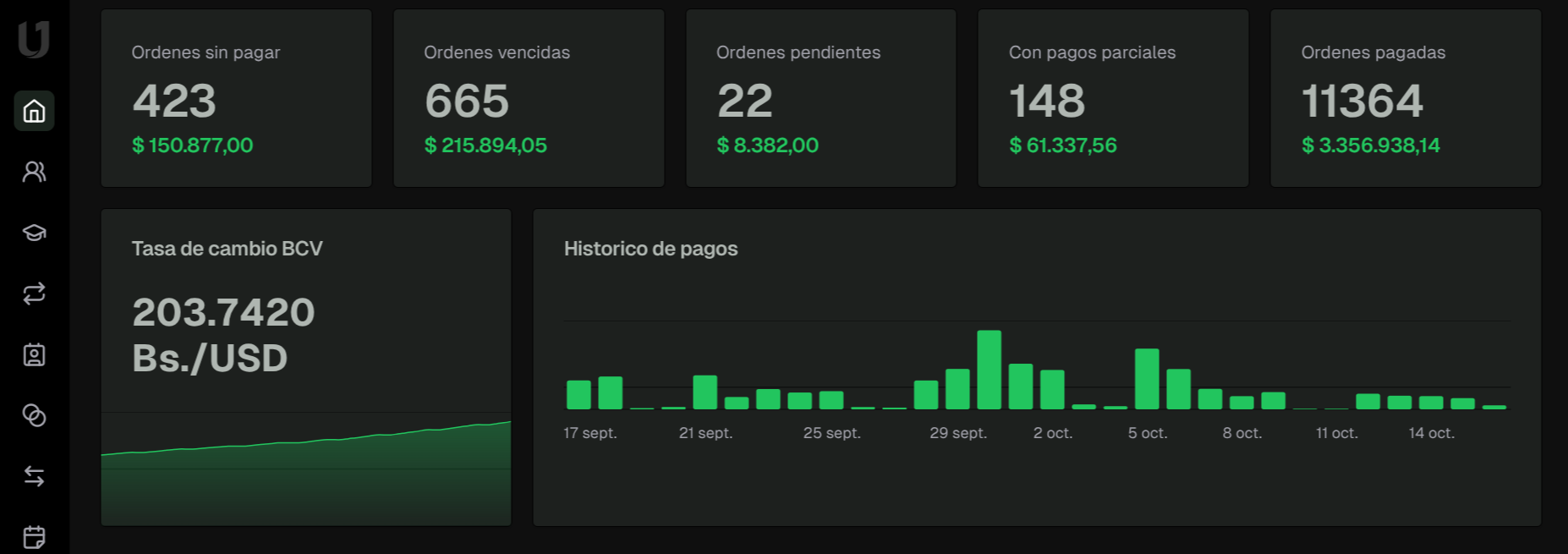 Es la pantalla principal que ves al ingresar al sistema. Te proporciona un resumen rápido y visual de todo lo importante que está sucediendo con los pagos de tu institución.